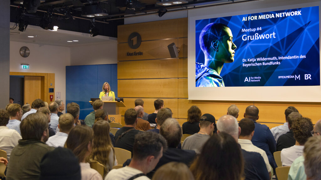 Bild- und Videoproduktion mit Hilfe von KI stand auch im Mittelpunkt des zweiten Meetups, das am 9. Juli im Bayerischen Rundfunk stattfand. BR-Intendantin Dr. Katja Wildermuth lobte in Ihrem Grußwort den Kooperationsgedanken des AI for Media Networks, in dem rund 500 Organisationen, darunter Sender, Verlage, Software-Hersteller und Hochschulen vertreten sind: „Im KI-Zeitalter sind wir als BR und als ARD nur ein Player unter vielen. Umso wichtiger ist es, auf Partnerschaften zu setzen. Das AI for Media Network ist dafür ein zentraler Baustein.“