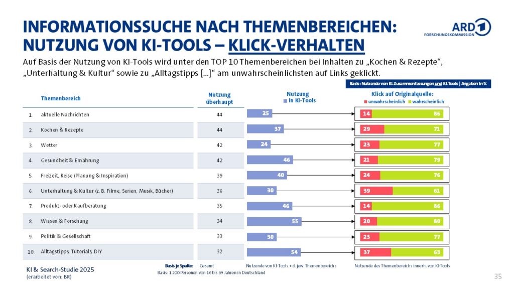 So sind bei KI-Zusammenfassungen in Suchmaschinen bei Themen wie „Wetter“, „Sportereignissen“ Links-Klicks zu Originalquellen unwahrscheinlicher. Gleiches gilt für Unterhaltungs- oder Alltagsthemen (wie z.B. Rezepte oder Alltagstipps), unabhängig davon, ob entsprechende Inhalte über KI-Zusammenfassungen in Suchmaschinen oder KI-Tools rezipiert werden.