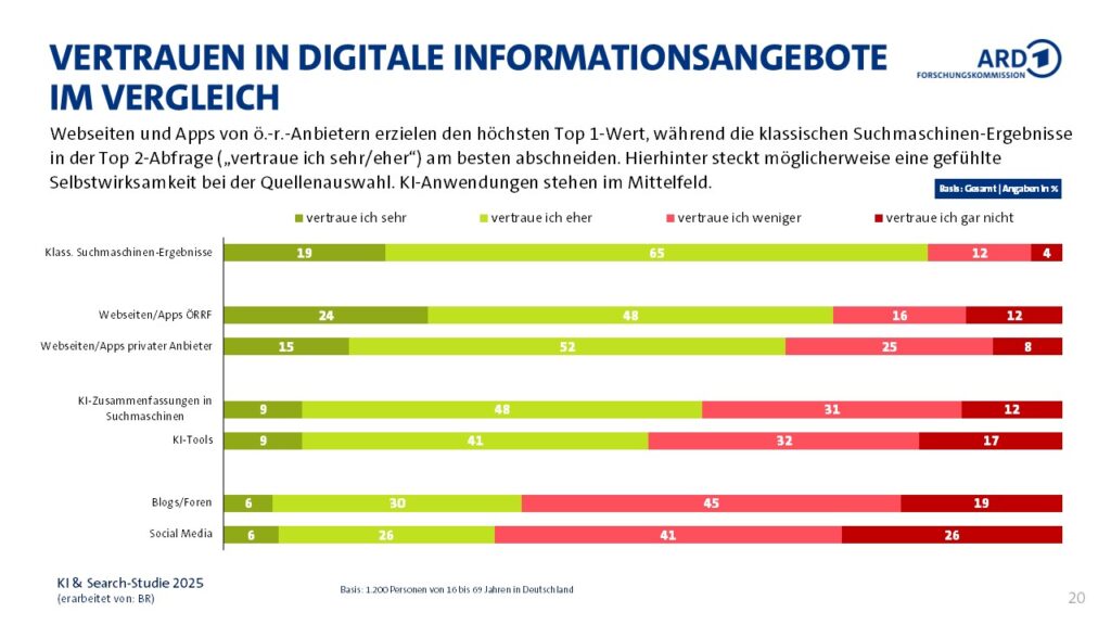Zweitens bleibt die Vertrauenswürdigkeit von Nachrichtenanbietern, insbesondere von öffentlich-rechtlichen und privaten Medien, hoch. Während KI-generierte Informationen nur begrenztes Vertrauen genießen, vertrauen die Nutzenden klassischen Suchmaschinenergebnissen sowie den Websites und Apps von etablierten Medien deutlich mehr. Diese Faktoren unterstreichen die anhaltende Relevanz und Bedeutung von redaktionell gestalteten Nachrichtenangeboten und professionellen SEO-Aktivitäten in der digitalen Informationslandschaft.